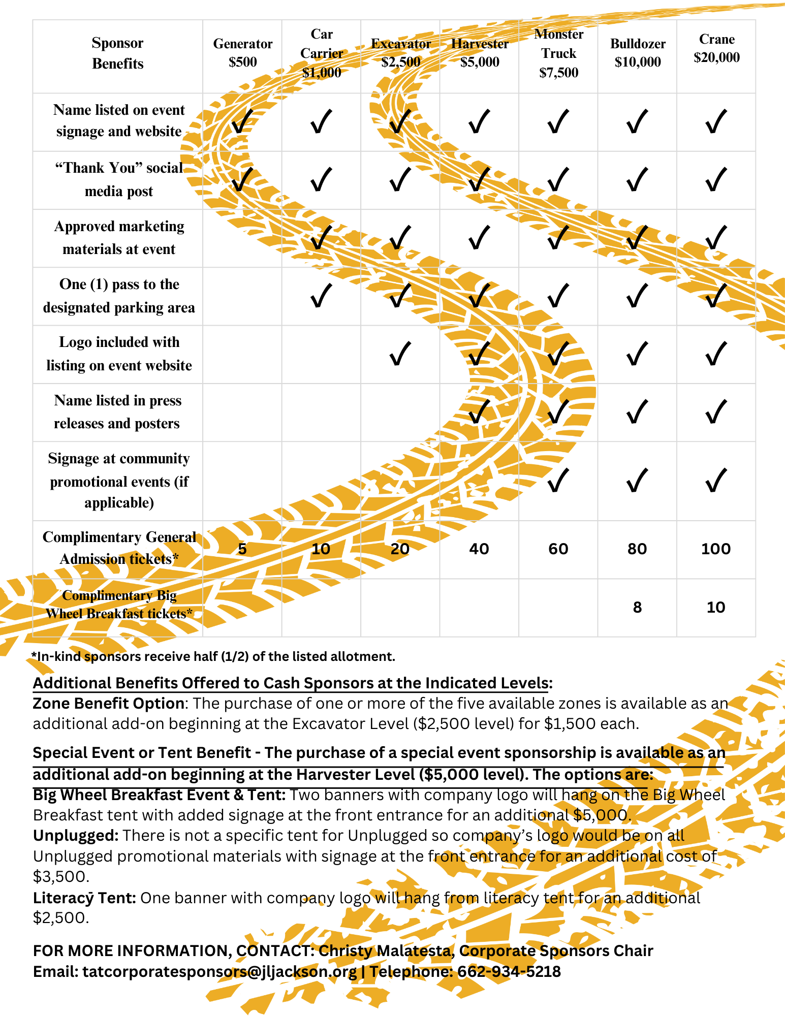 For additional information about 2026 Corporate Sponsor opportunities and additional ways to support Touch A Truck® Jackson, please contact Christy Malatesta, Corporate Sponsors Chair, at tatcorporatesponsors@jljackson.org or visit: https://ci.ovationtix.com/35392/store/donations/57398
